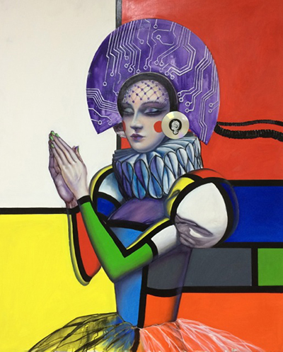 Mit welcher Leichtigkeit Patrick Boussignac im Bild „Praying Lady“ den kühlen Konstruktivismus von Piet Mondrian mit der Sinnlichkeit einer mittelalterlichen Anbetungsszene und der Omnipräsenz der Leiterplatten-Technologie vereint, ist bewundernswert. Dass die in ihr Zwiegespräch mit einer höheren Macht versunkene Schönheit asiatisches Make-Up, Pomp-Ärmel, eine niederländische Halskrause, eine CD als Ohrring, elektrische Leiterbahnen als Kopfschmuck, ein durchsichtiges Ballet-Tutu und grellgrün lackierte Fingernägel trägt, wirkt selbstverständlich, natürlich, leicht.