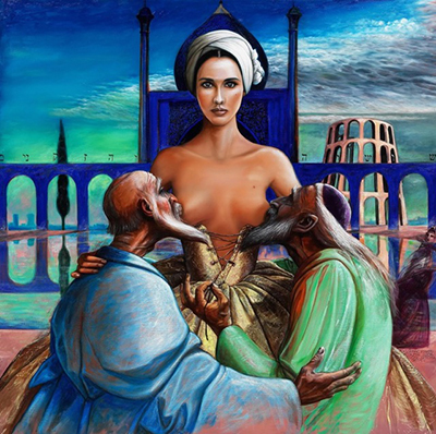 Auch im Gemälde „Suzanna and the old men“ sind die verschiedensten Kulturkreise miteinander vermischt. Während die auf der Brücke im Hintergrund balancierenden Schriftzeichen orientalischen Ursprungs sind, scheinen die beiden sich an den wohlgeformten Brüsten labenden Alten mit ihren langen Gewändern und der jüdischen Kappe (Kippa) der Bibel entsprungen zu sein. Das Gesicht der symmetrisch in die Bildmitte gerückten Dame könnte einer zeitgenössischen Kosmetik-Werbung entstammen, der Palast und der Turm rechts einem in 1001 Nächte entführenden Reise-Prospekt.